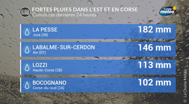 Entre 1 et 2 mois de pluies sont tombés localement ces dernières 24 heures entre le #Jura et la #Corse ! Des pluies intenses d'autant plus exceptionnelles que ces #pluies intenses surviennent après une #canicule historique sur la France ! pic.twitter.com/Atxy6ccbuw