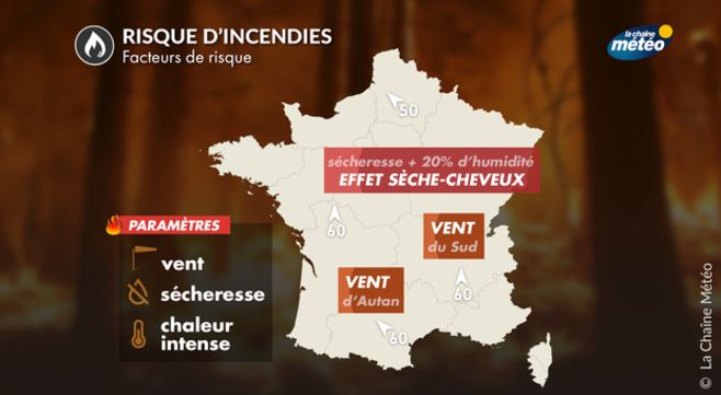 Régis Crépet : La journée à risque maximale sur la France est ce jeudi. Cette deuxième canicule de l'été provoque un nouveau coup de chalumeau sur des sols déjà desséchés, et la masse d'air est également très sèche. C'est un cercle vicieux : les sols s'assèchent, diminuant l'humidité potentielle pour la masse d'air. Cet engrenage augmente également le niveau des températures. D'autre part, le vent va se lever : vent d'Autan en Occitanie et la plaine toulousaine, vent du sud dans la vallée du Rhône, vent de sud-est sur la Bourgogne, les régions centrales et les Hauts de France. Ce vent de sud-est sera brûlant et très sec (20% d'humidité), favorisant les incendies de champs et de végétation à la moindre occasion (étincelles accidentelles avec le matériel, imprudence, mégots...).