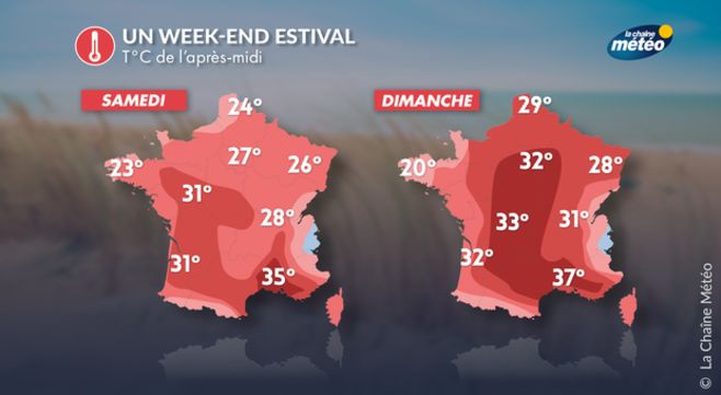 Les températures sont estivales avec de la chaleur mais sans connaître les excès caniculaires de la semaine passée. Mais elles deviendront très élevées dimanche et généralement comprises entre 25 et 33°C au nord et entre 30 et 35°C au sud avec des pointes à 38°C dimanche dans l'arrière pays méditerranéen.