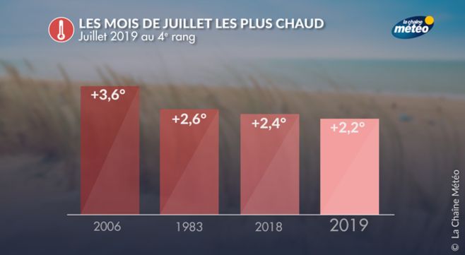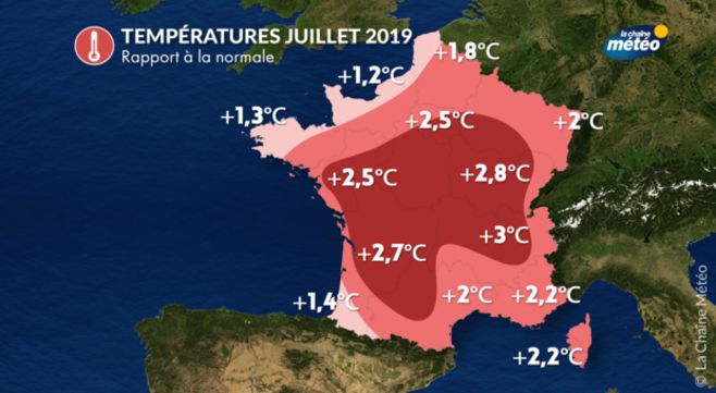 En moyenne sur la France, ce mois de juillet 2019 présente un excédent de températures de l'ordre de 2,2°C par rapport à la normale calculée sur la période 1981-2010. Il arrive donc en 4e position des mois de juillet les plus chauds, loin derrière le mois de juillet 2006 (+3,6°C) et juste derrière les mois de juillet 1983 (+2,6°C) et 2018 (+2,4°C).