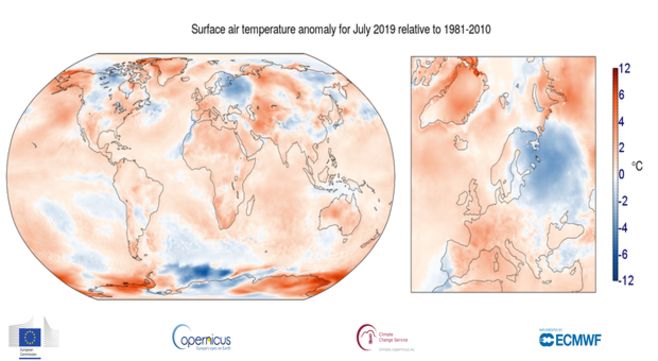 Selon le "programme européen de surveillance de la Terre", Corpernicus, le mois de juillet 2019 est le mois le plus chaud jamais enregistré dans le monde par rapport à la température moyenne pour un mois de juillet calculée sur la période de 1981-2010 (qui est de 16.07°C). La température moyenne pour ce mois de juillet 2019 sur le globe est de 16.63°C, soit un excédent de 0.56°C par rapport à la moyenne.