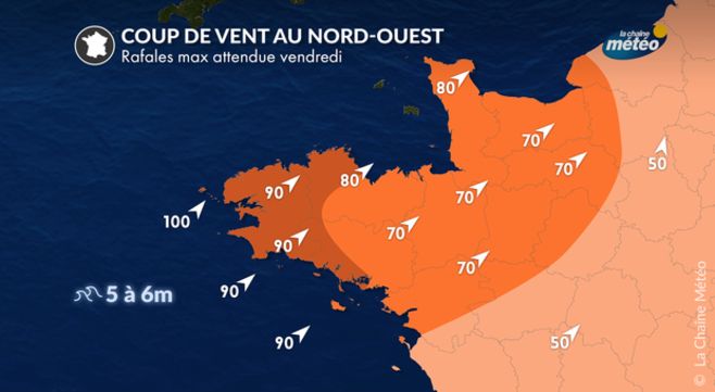Progressivement dans l’après-midi, le vent tournera au secteur sud-ouest et se renforcera de la Bretagne à la Loire Atlantique et en remontant en direction de la Normandie. Les rafales maximales dépasseront les 80 km/h sur les littoraux et en général 50 à 70 km/h dans les terres. C’est en fin d'après-midi que le pic d’intensité de ce coup de vent sera atteint, les rafales atteignant les 90 à 100 km/h sur la pointe bretonne et de 70 à 80 km/h à l’intérieur de la Bretagne.