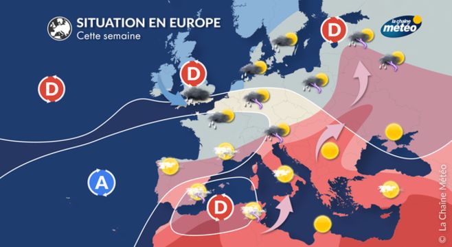 La France se retrouve en bordure de l’anticyclone des Açores avec des dépressions circulant des îles britanniques aux pays Scandinaves, apportant un flux maritime plus frais par le nord du pays. Ces conditions perdureront tout au long de la semaine.