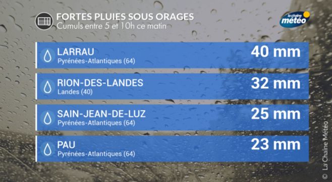 A 10h, les cumuls de pluies deviennent localement très importants avec 40mm à Larrau(64), 32mm à Rion-les-Landes(40), 25mm à Saint-Jean-de-Luz(64) et au Capbreton(40), 23mm à Pau(64), Il est tombé par endroit l'équivalent de 2 semaines pluies entre 5 et 10h ce matin.