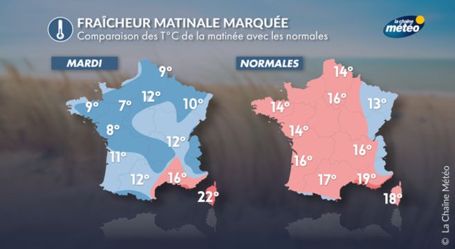 La fraîcheur s’installe dès le matin avec des valeurs dignes d’une fin septembre, en particulier au nord-ouest où les valeurs avoisinent à l’aube 6 à 9°C en campagne. Ailleurs, les valeurs ne sont guère plus élevées sauf dans le sud-ouest et près de la Méditerranée avec de 10 à 22°C du Grand-Est à l’arrière-pays Varois. Dans l’après-midi, le ressenti est souvent automnal malgré le soleil avec guère plus de 17 à 21°C au nord et 19 à 25°C au sud. Seul le midi Méditerranéen tire son épingle du jeu avec de 28 à 32°C.