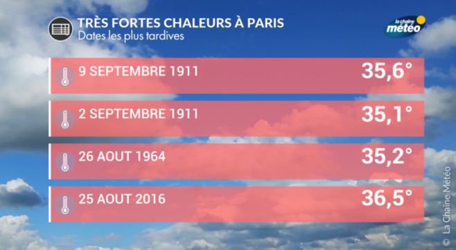 Rappelons que les très fortes chaleurs (un jour de très forte chaleur correspond à une journée où la température maximale atteint ou dépasse 35°C) peuvent se produire jusqu'au 8 septembre sur Paris comme en 1911.
