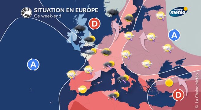 Pour demain dimanche, la baisse des températures affectera les 3/4 de la France avec le retour de valeurs de saison. Les maximales atteindront 19 à 25°C sur la moitié nord et 22 à 32°C au sud. Les très fortes chaleurs résisteront en direction de la Méditerranée.