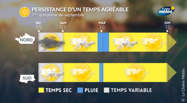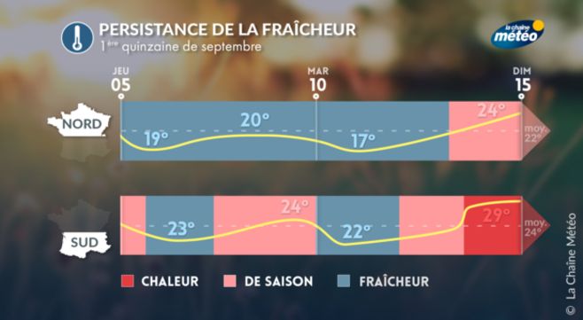 Les températures baissent par paliers sur la France tout au long de cette première quinzaine de septembre. D'une façon générale, ces températures seront inférieures de quelques degrés aux moyennes saisonnières. Mais la persistance de belles journées ensoleillées permettront d'éviter globalement un ressenti automnal, au détriment de la sécheresse qui s'accentue et du risque d'incendie de végétation en raison du Mistral en basse vallée du Rhône.