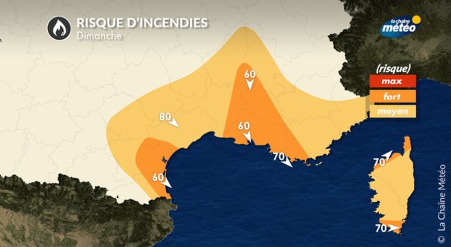 Mistral et tramontane ont continué de souffler fort dimanche avec des rafales voisines de 70 à 80 km/h et un temps toujours très sec. En conséquence, les garigues et massifs forestiers entre le Gard et l'intérieur de la Provence sont restés vulérables au risque d'incendies mais le risque est également important en se dirigeant vers l'Aude et les Pyrénées-Orientales ainsi que sur les extrémités de la Corse malgré quelques orages localisés. Ce soir, deux feux de végétation sont en cours dans l'Hérault du côté de Loupian près de Montpellier, entraînant une coupure et d'importants ralentissements sur l'A9 et plus à l'ouest, sur la commune de Puimisson.