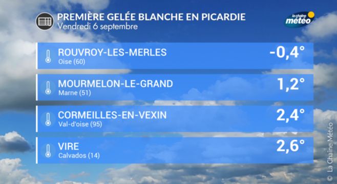 Peu avant le lever du jour, c'est à la station météo de Rouvroy-les-Merles que la température la plus basse a été observée avec une valeur de -0,4°C. C'est donc la première gelée en plaine au cours de ce début d'automne météorologique (du 1er septembre au 30 novembre), et elle survient très précocement sachant que les premières gelées s'observent en moyenne à la mi-octobre en Picardie.