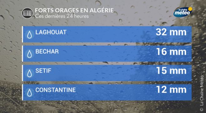 De mercredi à vendredi, d'autres orages ponctuellement violents balaieront l'Algérie et le nord de la Tunisie et du Maroc Localement, on attend jusqu'à 50 à 100mm d'eau dans les régions de Constantine, Tizi-Ouzou ou bien Sétif et Médéa en Algérie sous les cellules orageuses les plus intenses. De nouvelles inondations sont à redouter.