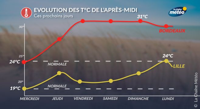 L’anticyclone se positionnant sur les îles britanniques, le flux bascule au nord-est sur la moitié nord. Ce vent de nord-est parfois modéré tempère ainsi l’atmosphère au nord de la Loire avec des températures maximales souvent comprises entre 20 et 27°C voire un peu moins le long de la Manche où le ressenti est beaucoup moins estival.