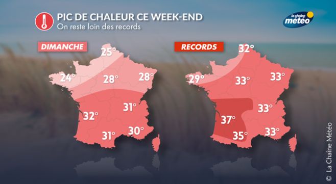Dimanche devrait être la journée la plus chaude au niveau national avec souvent plus de 30°C au sud et même 34°C dans le sud-ouest. Au nord de la Loire la chaleur sera également marquée et digne d'un plein été avec de 22 à 28°C. Il faut savoir qu'une telle masse d'air sur notre pays au milieu de l'été aurait donné une épisode caniculaire.