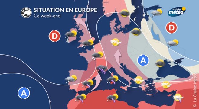 Samedi matin, les températures s'échelonneront de 7°C seulement dans les Ardennes à 20°C sur la côte basque et les bords de la Méditerranée. L'après-midi, il fera chaud samedi sur les ¾ du pays avec des températures entre 23 et 30°C avec quelques pointes à 32°C au pied des Pyrénées mais pas plus de 21°C près du Golfe du Lion en raison du vent marin et des pluies orageuses. Dimanche, la douceur sera généralisée en matinée avec 13 à 21°C et les maximales seront en nette baisse dans les régions centrales mais encore élevées à l'est avant les pluies et les orages. Il fera de 15°C au centre du pays à 26°C dans le Grand Est.