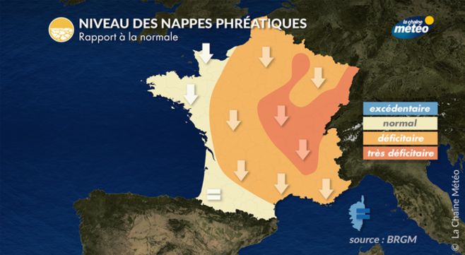 En cette mi-septembre, on constate que 73% des nappes phréatiques ont un niveau inférieur à la normale avec un déficit particulièrement accusé sur les régions du nord-est et du centre-est. Ces bas niveaux traduisent une recharge qui a été peu abondante au cours du dernier hiver du fait des précipitations déficitaires sur bon nombre de régions. Les pluies du printemps n'ont pas suffi pour rétablir la situation d'autant qu'elles ont profité surtout à la végétation en période de croissance. Selon le Bureau d'Etudes Géologiques et Minières (BRGM), seules les nappes alluviales de Corse ont pu bénéficié d'une recharge exceptionnelle en mai et ont permis d'amortir la période de décharge estivale avec un niveau qui reste supérieur à la normale. Le niveau des nappes est satisfaisant pour les nappes alluviales de l'Adour et du Gave de Pau étant donné les précipitations très abondantes au printemps dernier.