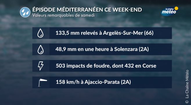 Il a beaucoup plus hier entre les reliefs des Pyrénées et du Massif central. On relève depuis le début de l'épisode, 133,5 mm à Argelès-Sur-Mer (66) et 111,6 mm à Castanet (34). Ces cumuls sont l'équivalent d'un peu plus de 3 mois de pluie sur ces régions. Dans une plus large mesure, il est souvent tombé 20 à 25 mm sur le Languedoc-Roussillon et 10 à 15 mm sur la région PACA. A noter que les intensités horaires étaient également très élevées en Corse, avec jusqu'à 48,9 mm tombés en une heure à Solenzara, un peu moins d'un mois de pluie sur cette zone.