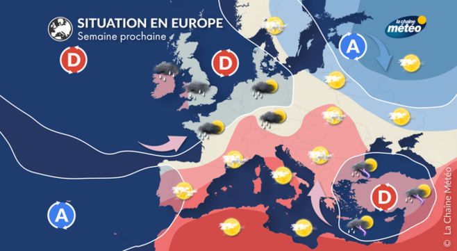 Un complexe dépressionnaire circule lentement tout au long de la semaine, entre le sud de l’Islande et l’ouest de l’Ecosse. Dans son prolongement, plusieurs perturbations vont traverser la France, avec des pluies souvent modérées et du vent soutenu. Plus au sud, notamment du Languedoc-Roussillon à la région PACA, le soleil domine avec encore un ressenti chaud.