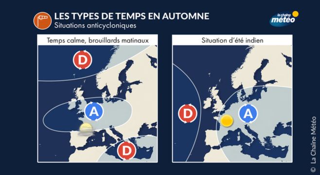 Si l'anticyclone des Açores migre souvent en direction de la France en été, il reprend régulièrement ses marques au cours de l'automne, si bien que l'on se retrouve à nouveau sous l'influence du courant d'ouest océanique et des dépressions circulant des Iles Britanniques vers la Scandinavie.