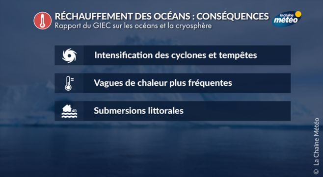 Avec le réchauffement des eaux, la zone de formation et de vie des cyclones pourrait s'étendre géographiquement et les phénomènes qui les accompagnent (vent, pluies, marées de tempête, submersions...) être plus intenses. Les tempêtes dans les zones tempérées risquent elles aussi de frapper avec plus de violence.