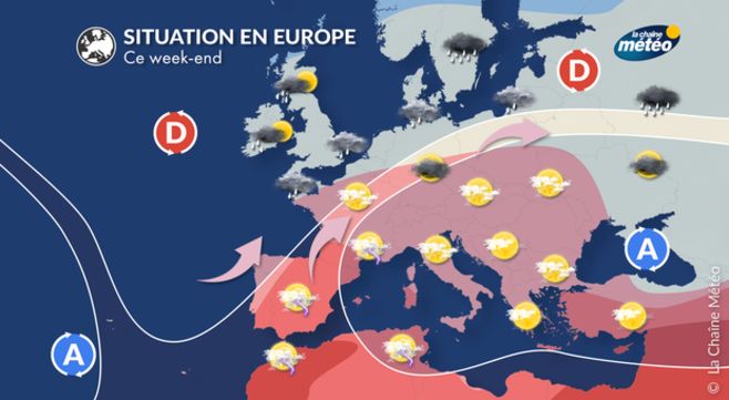 Sous l'influence d'une masse d'air chaud, il fait doux dès le matin avec 11 à 17°C au lever du jour, un peu plus frais dans les fonds de vallées. L'après-midi, comptez avec des températures entre 16 et 24°C des bords de la Manche à la Loire et de 25 à un peu plus de 30°C de Midi-Pyrénées à l'Auvergne-Rhône-Alpes jusqu'en Côte d'Azur mais autour de 22°C seulement près de la Méditerranée en raison du vent du sud qui amène des entrées maritimes samedi et dimanche. D'une manière plus générale, on se situera 3 à 9°C au-dessus des moyennes. Dans le sud-ouest, les températures maximales seront dignes d'une fin juillet avec des pointes à 33°C possibles au pied des Pyrénées par effet de foehn.