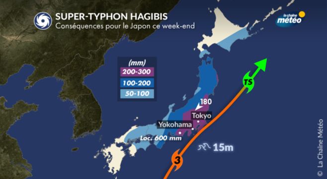 On prévoit également des vagues pouvant avoisiner les 17 mètres dans la journée de samedi sur le littoral sud de l’île principale, entre Nagoya et Tokyo. Des submersions marines sont probables. Le cumul des pluies pourrait être dantesque avec 300 mm à 400 mm en 24 h (de vendredi à samedi) de Osaka à Tokyo. Ce qui correspond à plus de deux mois de pluies ! Ces cumuls pourraient se doubler d'ici dimanche. Des inondations et des glissements de terrain sont à craindre.