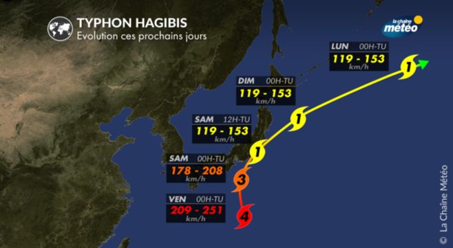 Un impact sur l'île principale du Japon est le scénario privilégié. Hagibis devrait toucher terre dans la journée de samedi dans la préfecture de Shizuoka. Le typhon ne touchera pas avec l'intensité que nous connaissons actuellement. En effet, les vents d'altitude finiront par affaiblir Hagibis et l'air sec qu'il rencontrera ne lui permettra plus de s'alimenter. Toutefois, Hagibis restera un violent typhon : il pourrait rester en catégorie 3.