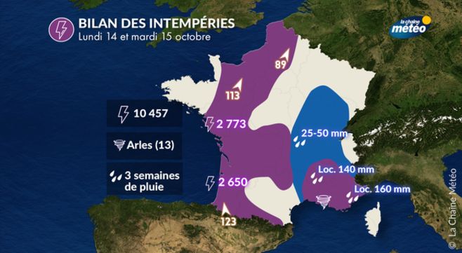 Mardi 15 octobre : fortes pluies au sud-est, tornade à Arles