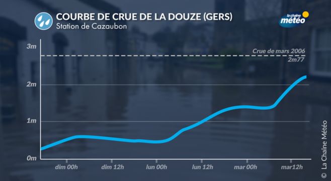Avec toutes ces précipitations, plusieurs cours d'eau sont en crue comme la Douze à Cazaubon (32) ou la Midouze à Campagne (40), mais les hauteurs d'eau sont encore loin des crues de référence de novembre 2000 ou de mars 2006. A noter quelques ruissellements et inondations dans les points bas suite aux fortes averses orageuses observées dans l'après-midi de mardi