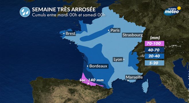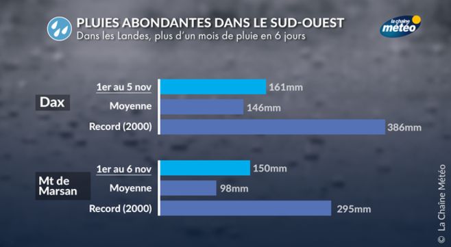 Dans ce flux océanique chargé en humidité, les précipitations sont quotidiennes et parfois soutenues sur l'ouest et le sud du pays. La Nouvelle-Aquitaine subit de plein fouet ce régime perturbé avec des pluies abondantes depuis la Toussaint. Les cumuls de pluie les plus importants concernent les Landes avec 150 millimètres recueillis du 1er au 5 novembre à Mont-de-Marsan, 161 mm à Dax ce qui correspond déjà à plus d'un mois de précipitations.