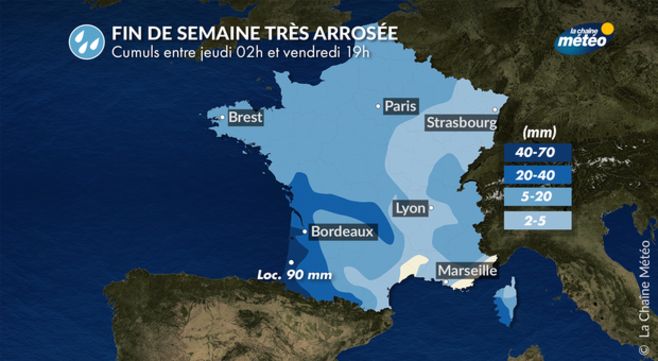 Avec l'arrivée d'un nouveau front, de nouvelles précipitations localement fortes sont attendues dès la soirée de samedi. Elles se maintiennent ensuite toute la journée de dimanche. Les cumuls seront à nouveau importants avec un risque de ruissellement et d'inondations, toujours sur les mêmes régions, c'est-à-dire entre les Landes et les reliefs pyrénéens. Les cumuls sur 24h seront souvent aux alentours de 50-60 mm.