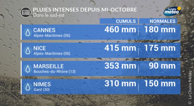 Puis, ces fortes pluies ont atteint la Provence Alpes côte d’Azur où elles se sont attardées plus longuement en raison du creusement d’une petite dépression au large de la Provence qui a retardé l’amélioration. Ainsi sur ces dernières 36 heures, il est tombé entre 150 et 250mm de pluies sur le Var et les Alpes Maritimes, avec des pointes entre 300 et 350mm sur l’est du Var et l’ouest des Alpes-Maritimes (350mm à Tanneron dans le Var), équivalant à 2 à 3 mois de pluies.