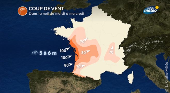 Mardi, c'est toute la façade atlantique et les côtes de la Manche qui seront les plus exposées à ce vent fort. Les rafales pourraient atteindre 90 km/h à 100 km/h sur la côte et 70 à 80 km/h dans les terres. Le vent se renforcera en fin de journée de mardi sur toute la façade atlantique et atteindra son paroxysme la nuit suivante.