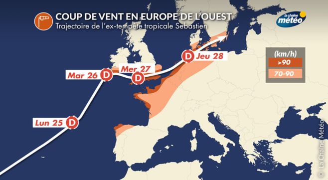 Après la tempête tropicale Lorenzo, née près des tropiques dans le nord du bassin Atlantique début octobre et qui a donné un coup de vent sur les îles britanniques, une deuxième tempête tropicale nommée Sebastien se dirige vers l'ouest de l'Europe entre mardi et jeudi, ce qui est exceptionnel pour une fin novembre.