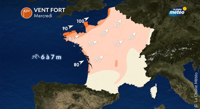 Mercredi, le rapprochement de la dépression et son évolution le long des côtes anglaises engendreront un fort resserrement du gradient de pression en Manche. Dans ce contexte, le vent soufflera fort sur toute la moitié nord et plus particulièrement sur les côtes de la Manche, entre la pointe du Cotentin et la côte d'Opale.