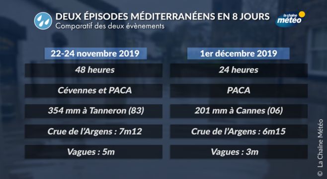 Une semaine après un épisode méditerranéen remarquable, de nouvelles fortes pluies ont touché les Bouches-du-Rhône, le Vaucluse, le Var et les Alpes-Maritimes ce dimanche 1er décembre. Une situation remarquable en termes de cumuls sur l'évènement et exceptionnelle du fait qu'elle s'est produite tout juste une semaine après le précédent épisode méditerranéen.