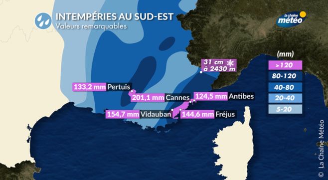 Au cours de l'après-midi, les averses orageuses se sont rapidement intensifiées. De fortes pluies se sont maintenues quelques heures entre le Vaucluse, le Var et les Alpes-Maritimes. Au cours de cet épisode, il est souvent tombé 100 à 150 mm en 24 h, l'équivalent de plus d'un mois de pluies. Sur Cannes, la situation était particulièrement explosive, avec plus de 200 mm en 24h, ce qui a provoqué de nombreuses inondations.