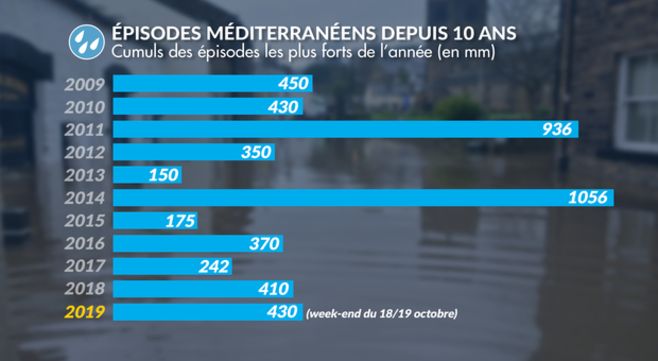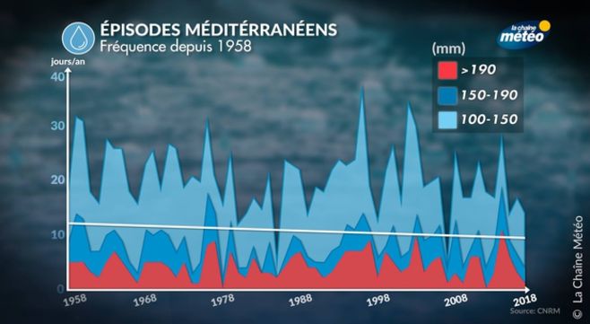Certaines années sont plus actives que d'autres, à l'image des saisons cycloniques qui ne sont jamais totalement semblables en fonction de la variabilité climatique. Ainsi, on dénombre en moyenne de 2 à 5 épisodes méditerranéens par an en France, sachant qu'ils se déclenchent majoritairement en automne. Le mois d'octobre est le plus actif, suivi de novembre. Normalement, en décembre, les épisodes diminuent puis cessent. A ce jour, le sud-est de la France a connu 3 épisodes méditerranéens : celui du 23 octobre, responsable des inondations dans l'Aude et dans l'Hérault (secteur de Béziers), puis celui du 24 novembre, responsable des inondations majeures du Var et des Alpes-Maritimes, et enfin celui du 1er décembre, dont l'intensité maximale s'est produite dans le secteur de Cannes (06).
