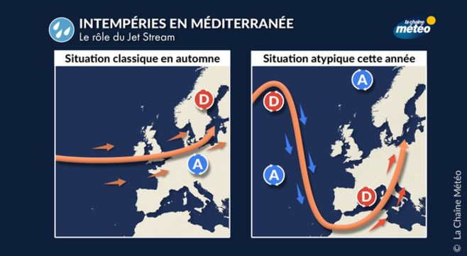 Le phénomène véritablement aggravant cette année est lié aux ondulations du jet stream, ces vents de haute altitude qui pilotent les dépressions et les masses d'air. Le jet stream circule généralement à grande vitesse selon une trajectoire plutôt rectiligne, propulsant les dépressions atlantiques d'ouest en est. Or, depuis quelques années, et notamment cet automne, on assiste à un ralentissement de ce courant jet, lequel évolue en méandres, à l'image d'un fleuve. Ces méandres sont récurrents depuis le début de l'automne et entraînent les dépressions de l'Atlantique nord vers le sud, c'est-à-dire vers la péninsule ibérique puis vers l'ouest de la Méditerranée, dont les côtes françaises. Il en résulte de fréquents épisodes de mauvais temps dans le sud de notre pays, de la Nouvelle Aquitaine (touchée aussi par une pluviométrie exceptionnelle) à la région PACA. Dans ce contexte, on ne peut pointer du doigt la température de la mer comme responsable, mais plutôt une circulation atmosphérique atypique.
