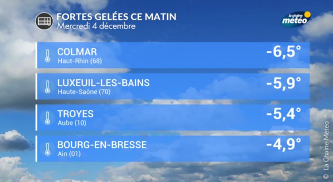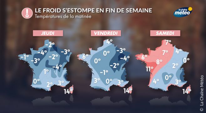 Avec le retour de conditions anticycloniques sur la plus grande partie du pays, de l'air froid et dense stagne dans les très basses couches de l'atmosphère. Résultat, les gelées matinales sont fréquentes et parfois fortes avec jusqu'à -6,5°C observé à Colmar-Meyenheim ce mercredi matin. Quand retrouvera-t-on une météo moins froide?