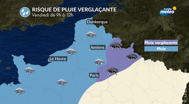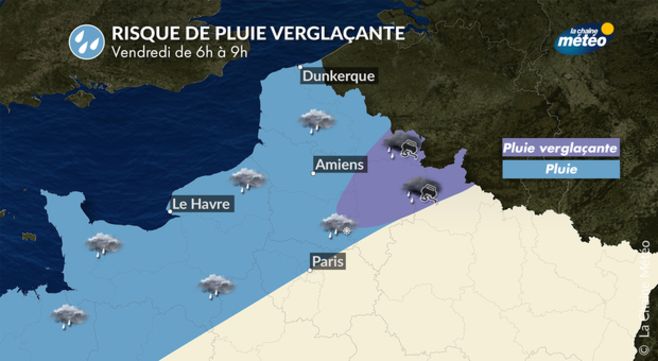 De l’Île-de-France aux Hauts-de-France, le ciel couvert donne également des pluies faibles et intermittentes qui peuvent être très temporairement verglaçantes de l’est de l’Aisne à l’Avesnois.