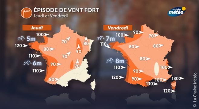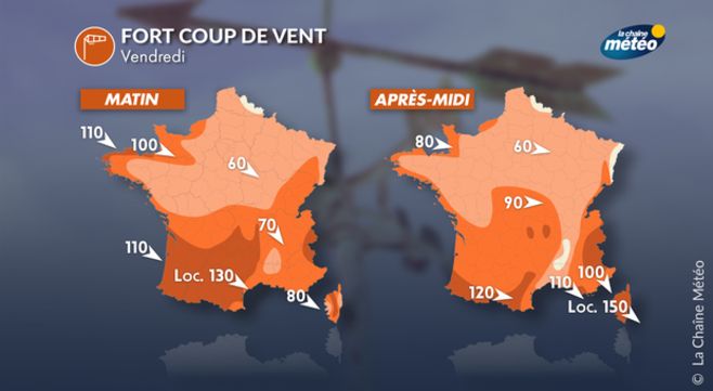 Vendredi, des vents violents concerneront la côte aquitaine et les plaines du sud-ouest avec 90 à 100 km/h, localement 120 km/h sur la côte basque. La situation sera possiblement tempétueuse sur ces zones situées entre Atlantique et Méditerranée, longeant le piémont pyrénéen. Le vent deviendra violent en Méditerranée avec des rafales tempétueuses en mer mais aussi sur les caps exposés du littoral (Cap Béar, les extrémités de la Corse) avec des rafales maximales de 120 à 150 km/h.