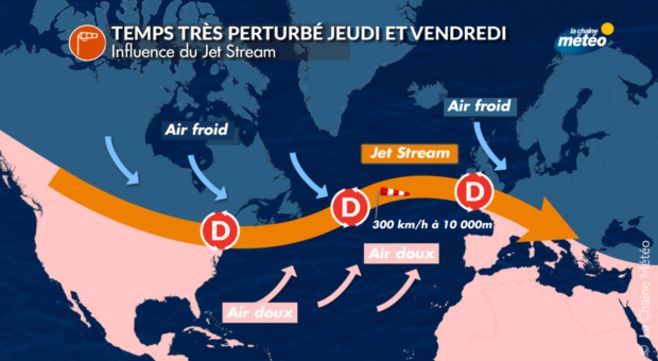 Cette situation météorologique est due à une accélération du jet stream, ces vents de haute altitude qui traversent l'océan Atlantique à environ 8000 m d'altitude. Ces vents, soufflant en moyenne à 170 km/h, approcheront les 300 km/h vendredi et samedi en passant sur la France. Ce n'est pas exceptionnel mais suffisant pour dynamiser les dépressions, qui sont comme propulsées vers la France dans un défilé très rapide. Ce contexte est propice au creusement de dépressions possiblement tempétueuses.