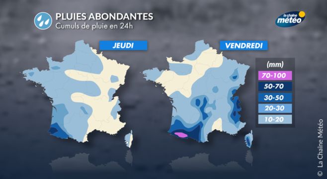 Les précipitations les plus abondantes se produiront sur le quart sud-ouest du pays et sur les versants ouest de tous nos reliefs. Sur les plaines du sud-ouest on attend 30 à 50 mm mais les cumuls de pluie atteindront 60 à 80 mm sur les contreforts ouest du Massif-Central et plus de 100 à 150 mm sur les hauteurs des Pyrénées occidentales. Il faudra surveiller le risque de crues et d'inondations sur le bassin versant de l'Adour (les Gaves, la Binouze et la Nive), étant donné la saturation en eau des sols. Sur les reliefs, la neige tombera dès 1100 m sur le Massif-Central et 1500 m sur les Pyrénées, avec des quantités devenant remarquables en altitude sur les Pyrénées.