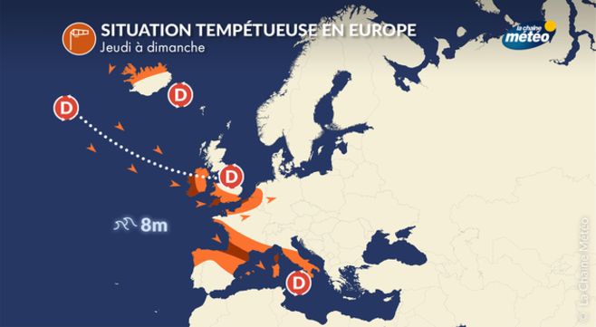 Dans un contexte devenant fortement dépressionnaire sur l'Europe de l'ouest jusqu'au week-end, un défilé de perturbations très musclées balaiera la France de ce jeudi après-midi à samedi matin. Ces perturbations circuleront de l'arc Atlantique vers la Méditerranée en passant sur un large tiers sud-ouest du pays. L'évolution ultérieure pour le week-end reste incertaine, mais les vents pourraient rester soutenus sur le nord de la France samedi.