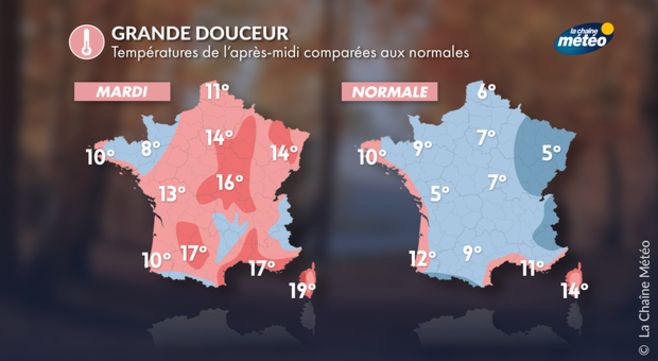 Malgré un enchaînement de perturbations tout au long de la semaine, les températures restent élevées, notamment mardi avec des températures souvent 5 à 9°C au-dessus des normales.