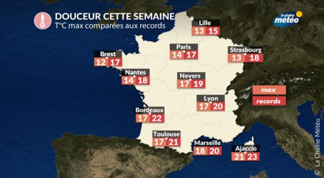 Les températures gagnent encore quelques degrés, avec des maximales pouvant souvent avoisiner 17 à 20°C de l'Occitanie à la Corse, en passant par la région PACA.