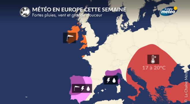 L'Europe présente un double visage cette semaine. La péninsule ibérique se trouvera toute la semaine dans des épisodes de forts intempéries tandis que l'Europe de l'est rencontrera une douceur rarement vue pour cette période de l'année.
