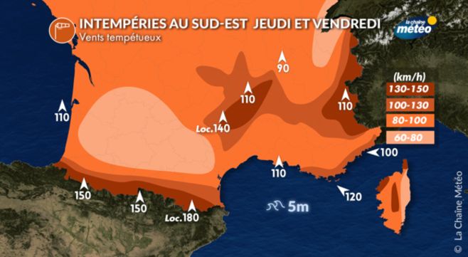 Sur les crêtes pyrénéennes et les hauteurs du Massif central, le vent de sud à sud-est sera particulièrement violent. Les rafales maximales atteindront 120 km/h sur la montagne Noire, les Cévennes et en remontant vers le Vivarais et le Velay. Sur les cimes pyrénéennes, les rafales pourront atteindre jusqu'à 140 km/h vers 1800 à 2000 m. A noter aussi des vents forts du golfe de Lion et de la Provence aux vallées du Rhône et de la Saône avec des rafales de 90 à 100 km/h.