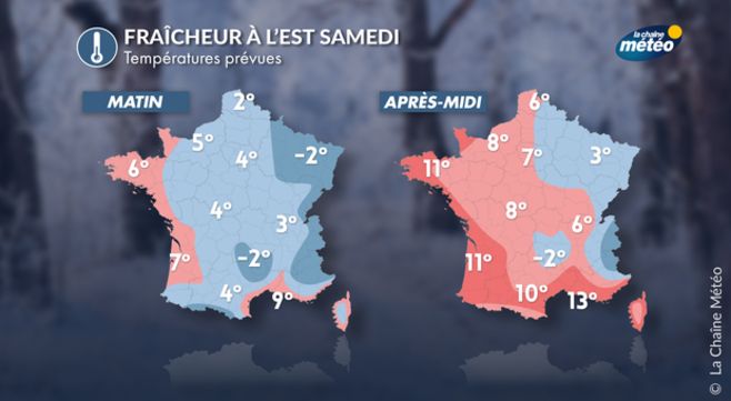 Les températures ce matin affichent 3 à 8°C et sont plutôt clémentes. Quelques petites gelées sont néanmoins observées au lever du jour près des frontiuères allemandes et luxembourgeoises. Plus à l’ouest et vers la Méditerranée, les températures affichent 6 à 10°C.
