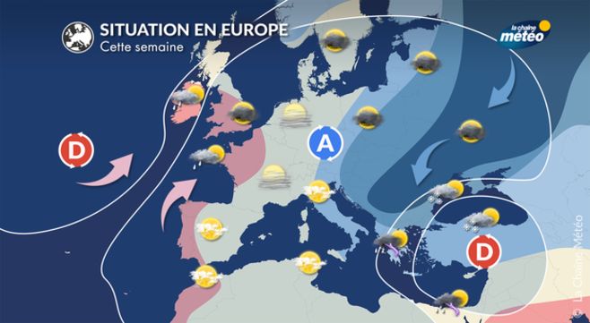 L'anticyclone qui nous protège en début de semaine sera bousculé par une petite dépression qui glissera de la Bretagne aux Pyrénées mardi et mercredi. Puis à partir de vendredi, une perturbation descendra des îles britanniques vers les régions centrales, apportant beaucoup de nuages mais très peu de pluies car les pressions resteront élevées, largement supérieures à 1025 hPa.